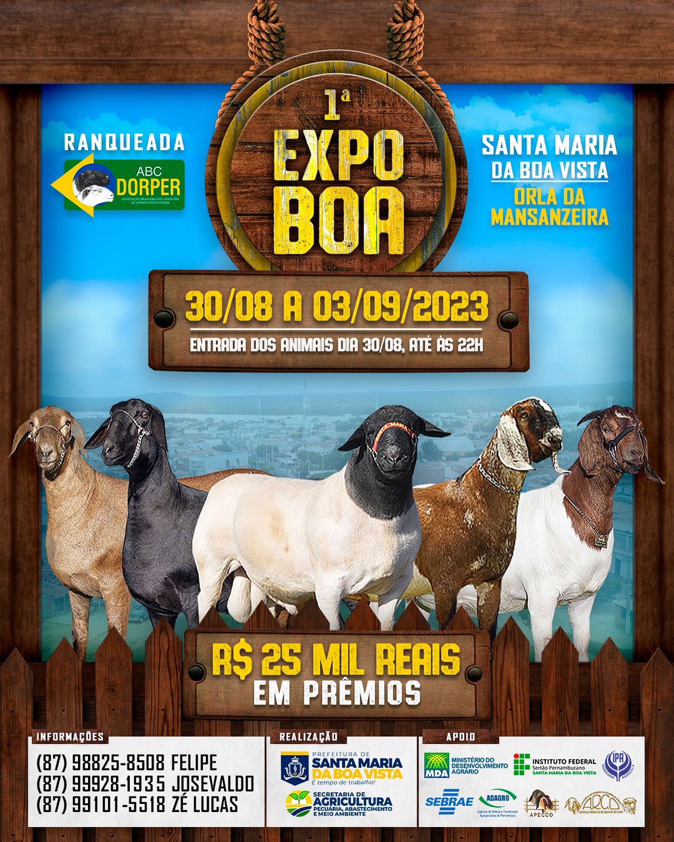 1ª ExpoBoa, feira de caprinos, ovinos e agricultura familiar de Santa Maria da Boa Vista. Ao todo, serão R$ 25 mil em premiações para os melhores animais de cada raça. O evento vai rolar na Orla da Mansanzeira, de 30 de agosto a 03 de setembro, contando com uma ampla programação. Vamo simbora fazer uma linda exposição em nossa cidade!