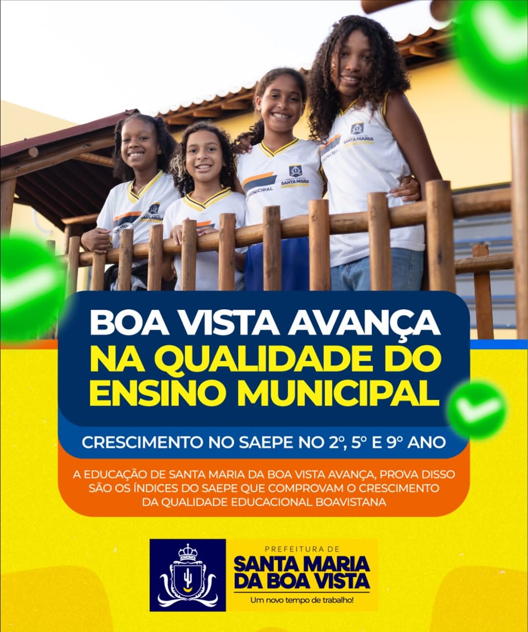 A educação boavistana segue crescendo, e prova disso são as notas alcançadas no SAEPE 2024, divulgadas recentemente. Avançamos em língua portuguesa e matemática no 2º, 5º e 9º ano, mostrando que os investimentos realizados na Rede Municipal estão dando resultados. No 2º ano, a nossa nota avançou de 554 para 617. Já no 5º ano, saímos de 4,9 para 5,7. No 9º ano não foi diferente: avançamos de 4,0 para 4,1. Resultados excelentes que comprovam o crescimento do setor educacional de Santa Maria da Boa Vista. Vamos seguir trabalhando pra fazer da nossa cidade um lugar cada vez melhor de se viver! 😍👨🏫👨🏻🎓