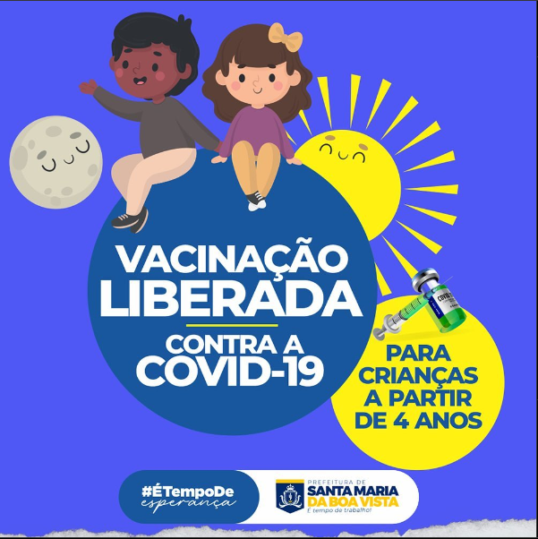 Atenção papais e mamães, a vacinação contra a COVID já está liberada para a criançada a partir de 4 anos. Basta comparecer até as unidades de saúde da sede ou interior para receber a dose de esperança! 💛💉 #VacinaSim 26 DE JULHO DE 2022
