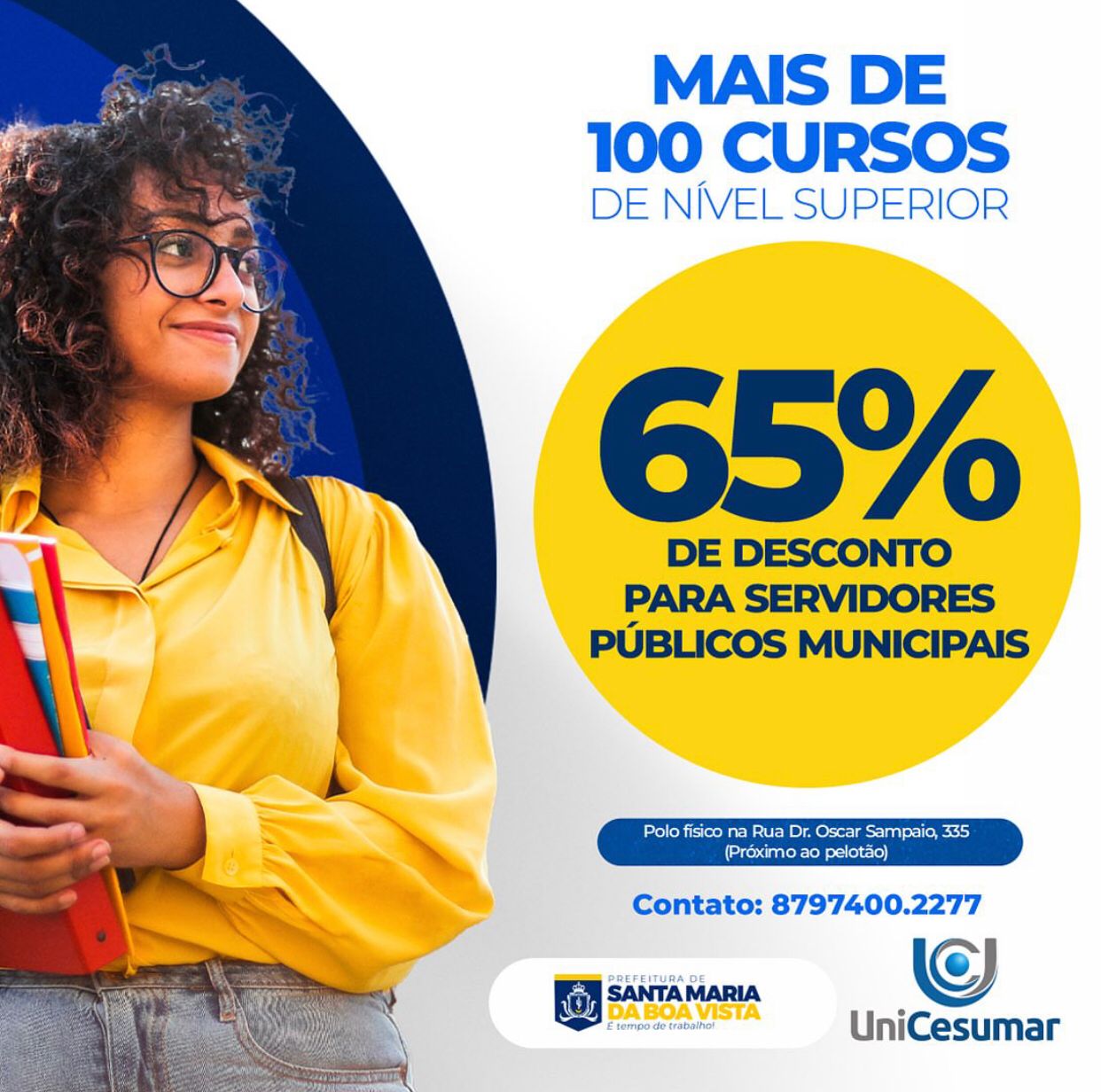 A prefeitura firmou parceria com a Universidade Unicesumar para assegurar 65% de desconto na mensalidade dos cursos superior ofertando pela instituição. ao todo, são mais de 100 opções de graduação.