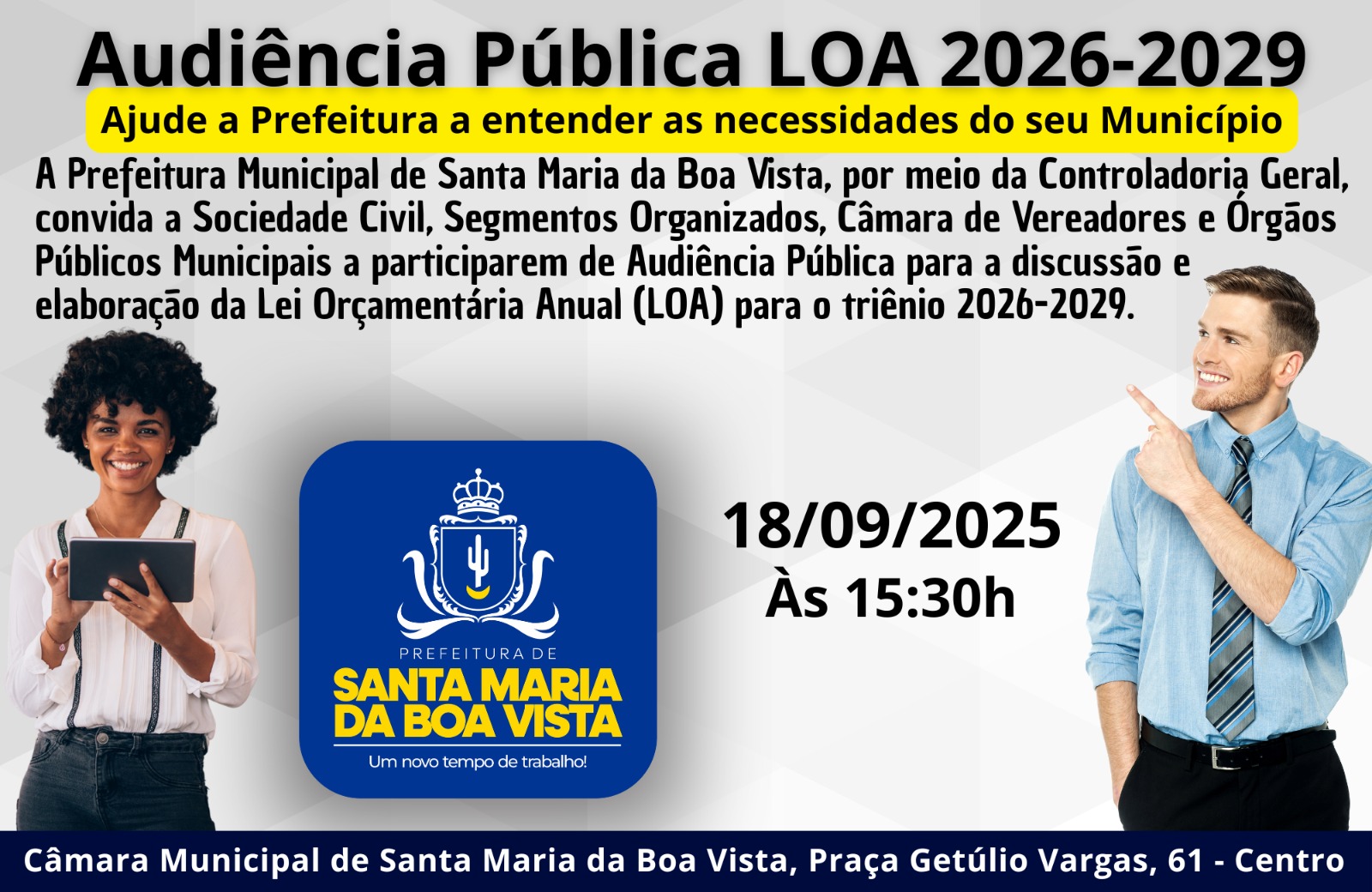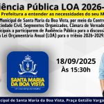 A Prefeitura Municipal de Santa Maria da Boa Vista, por meio da Controladoria Geral, convida toda a sociedade civil, segmentos organizados, Câmara de Vereadores e órgãos públicos municipais para participarem da Audiência Pública da Lei Orçamentária Anual (LOA) para o triênio 2026-2029.